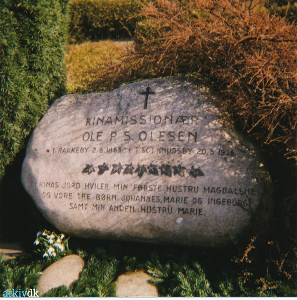 På gravstenen fortæller Ole P.S. Olesen om sit livs smertepunkter, tabet af tre børn og hustru Magdalene, som døde i Xiuyan i 1922, hvor hun blev begravet.