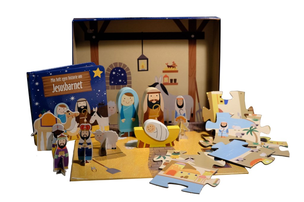 En fin gave til børn – legetøj og Bibelberetning i én. I æsken få man både puslespil, krybbespil og bog.
